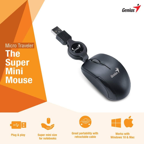 O super mini mouse genius possui um cabo retrátil com interface usb plug & play. Ideal para você usar com o seu notebook graças ao seu tamanho portátil, sendo muito mais confortável do que o touch pad dos notebooks. Além disso, o genius apresenta um controle avançado de precisão com engine óptica de 1200dpi.
